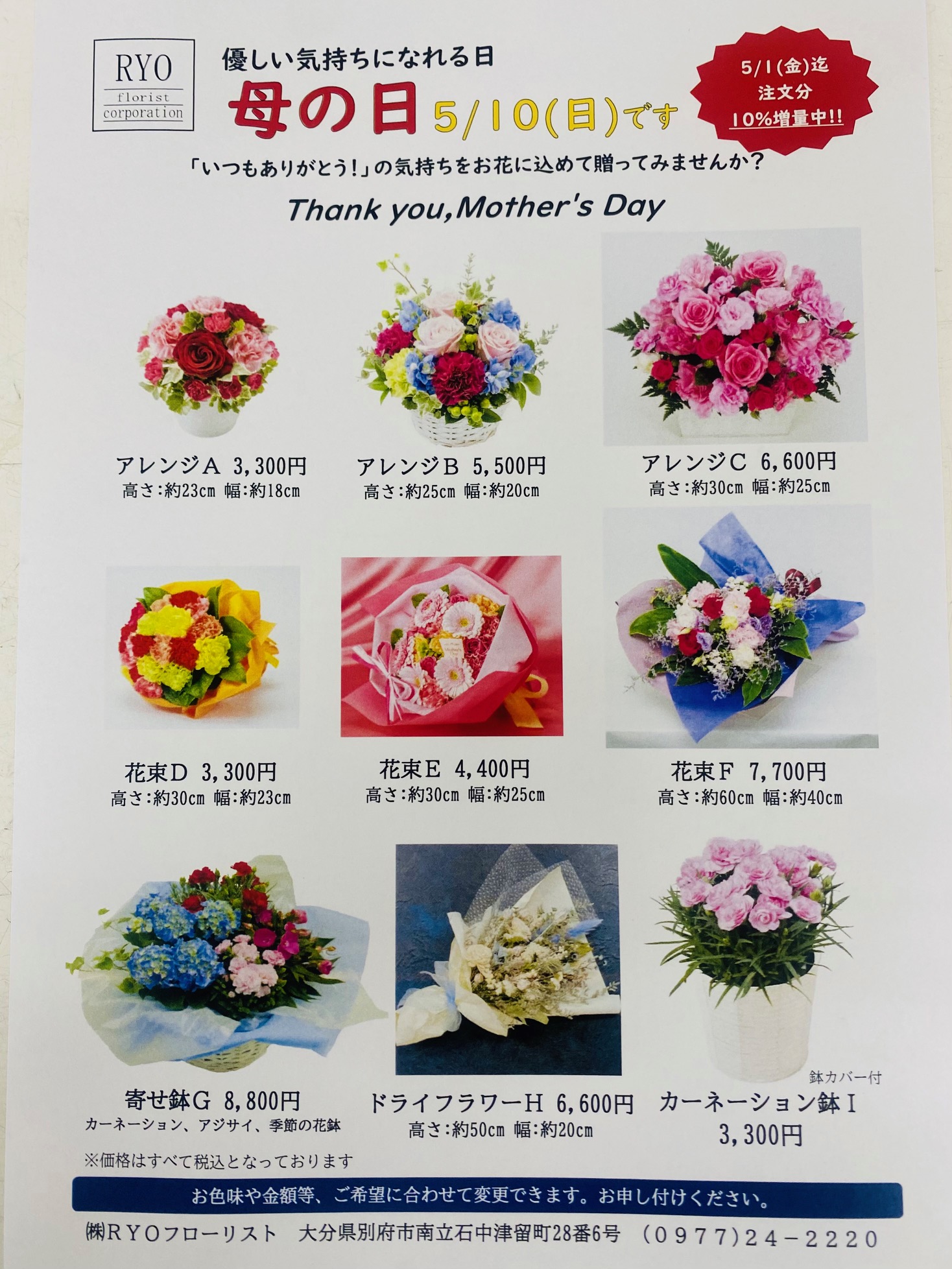 26.04.04 お知らせ Happy Mother’s Day 5月10日は母の日です。 日頃の感謝を込めてお花を送りませんか。 花束、アレンジメントフラワー、ドライフラワー等ご予約受けたまわり中です。 一覧に戻る